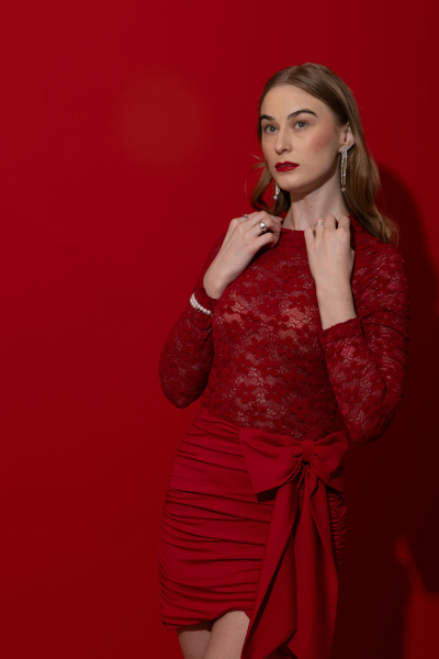 A stunning red lace bodycon mini with sheer elegance and a statement waist bow that turns every entrance into a moment.