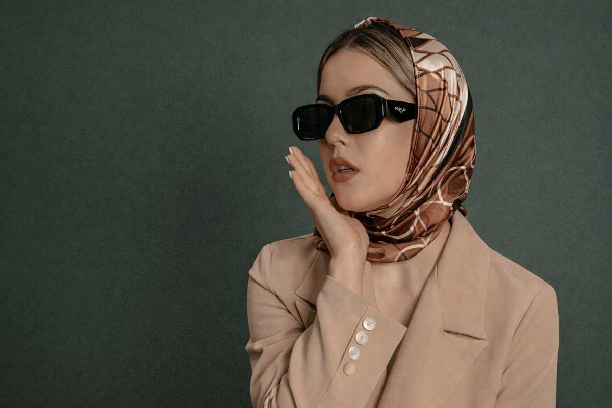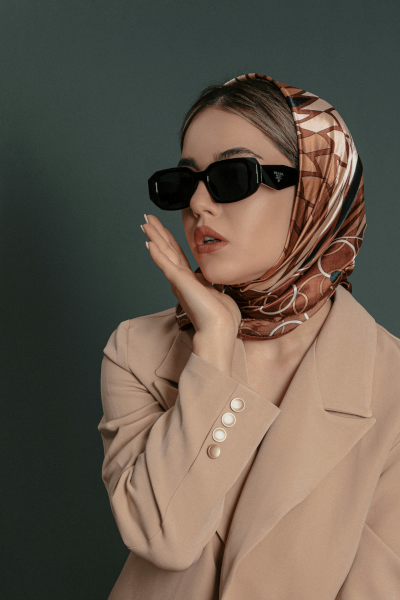 A classic beige blazer paired with a silky printed scarf for a look that speaks effortless sophistication.